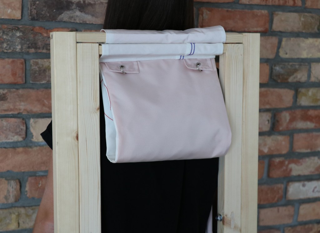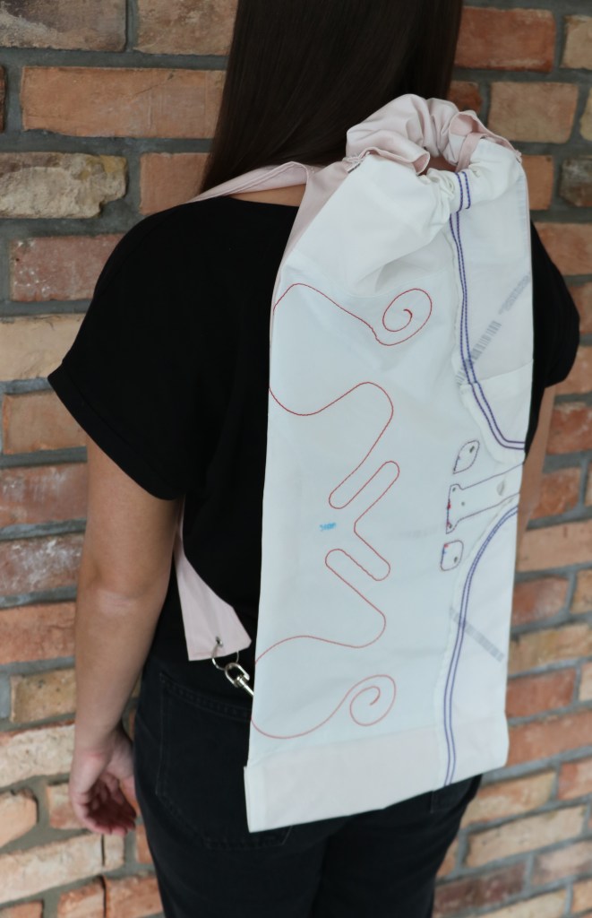 THE MODEL IS BASED ENTIRELY ON SCRAP MATERIAL AND IS DESIGNED TO SHOW THE POTENTIAL OF UPCYCLING AND AIRBAG FABRIC.