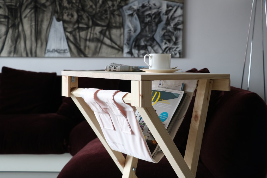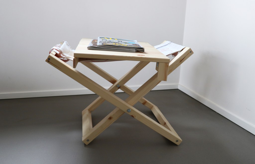 A WOODEN TABLE TOP COMPENSATES THE SIZE DIFFERENCE OF THE TWO FRAMES AND MAKED IVAA A SIDE TABLE.