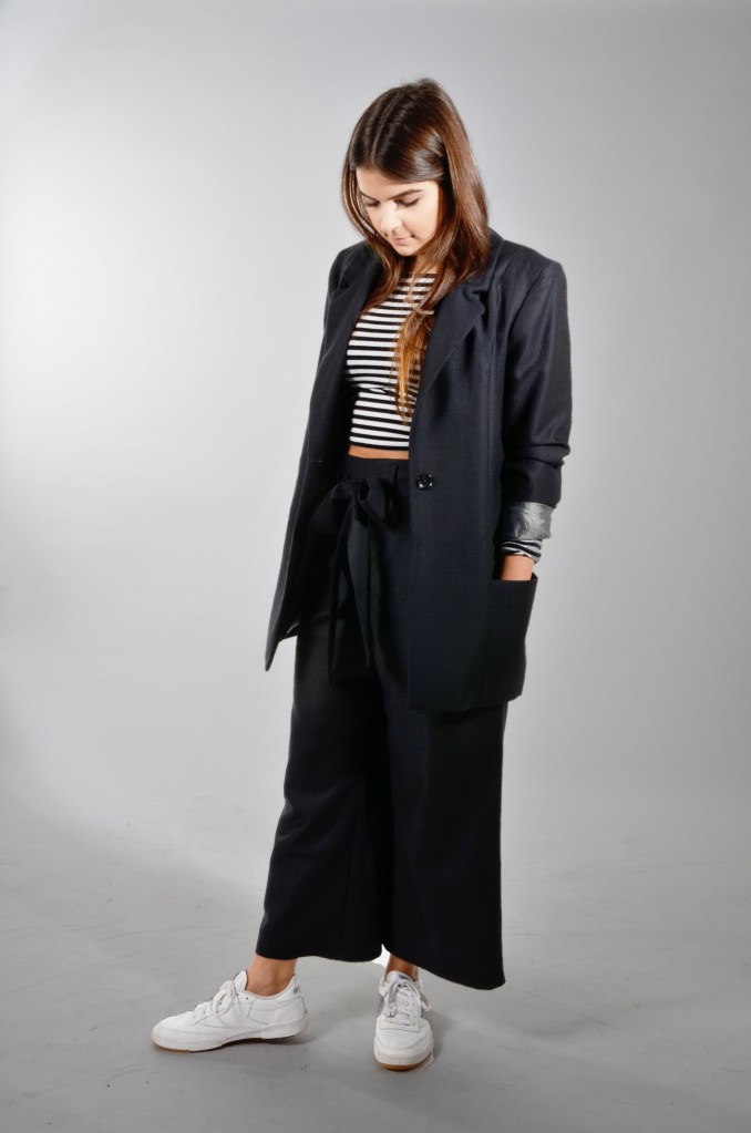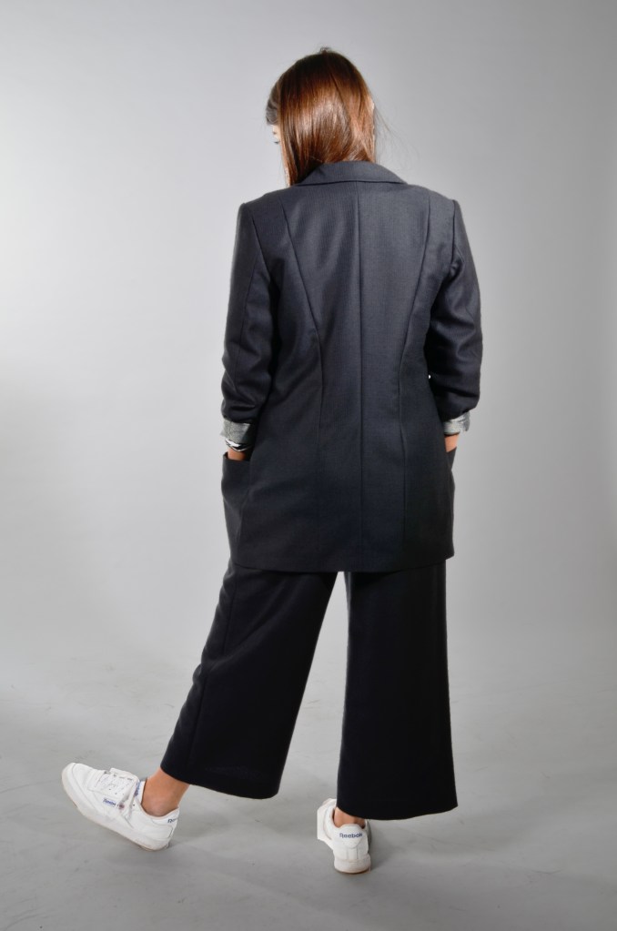 THE FIT OF THE JACKET AND THE CULOTTE IS VERY STRAIGHT AND MINIMALISTIC. TO MOVE THE SPECIAL FABRIC IN FRONT, THE STRUCTURE OF THE CHOSEN FABRIC IS INSPIRED BY DIFFERENT SURFACES WE CAN FIND IN THE NATURE. THE LOOSE FIT ALSO ALLOWS THE COMBINATION WITH SPORTIVE PIECES SUCH AS T-SHIRTS OR SNEAKER.