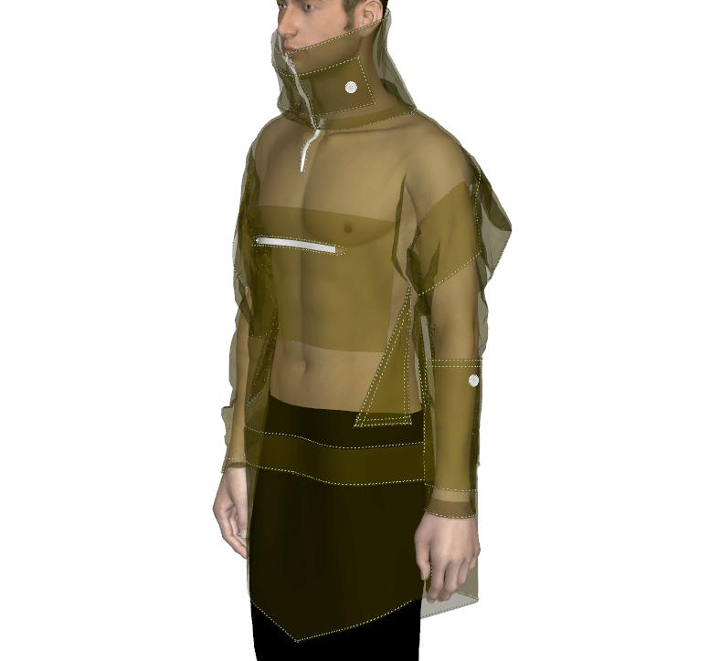 …MEANS THAT NO FABRIC RESIDUE IS THROWN AWAY BECAUSE THE ENTIRE SURFACE IS USED FOR THE DESIGN. TO TRY OUT POSSIBLE DESIGNS THE 3D-SOFTWARE CLO WAS USED.